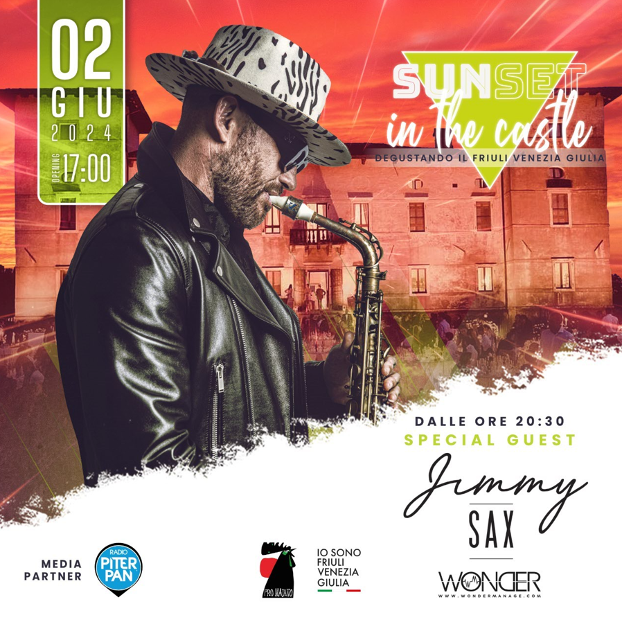 Dopo il grande successo delle scorse edizioni, che hanno visto protagonisti tra gli altri Bob Sinclar e Benny Benassi, torna un evento entrato nel cuore del pubblico del Friuli Venezia Giulia e non solo, Sunset in the Castle – Degustando il FVG, happening che unisce il meglio della musica internazionale, la migliore gastronomia made in Friuli Venezia Giulia e una venue da sogno quale quella del Castello di Susans. Protagonista assoluto dell’edizione 2024, in programma domenica 2 giugno, (a partire dalle 17.00) sarà la star mondiale del sassofono, Jimmy Sax. Con il suo sound unico, che gli ha permesso di imporsi sui palcoscenici più esclusivi del globo, il musicista e performer emozionerà e farà ballare il pubblico del castello all’ora del tramonto. Ad arricchire l'evento anche il dj set di Tommy Vee, il progetto Apex Sound Inside Nature e i set di Manuel Zolli dj e dj Daniel Vitagliano.